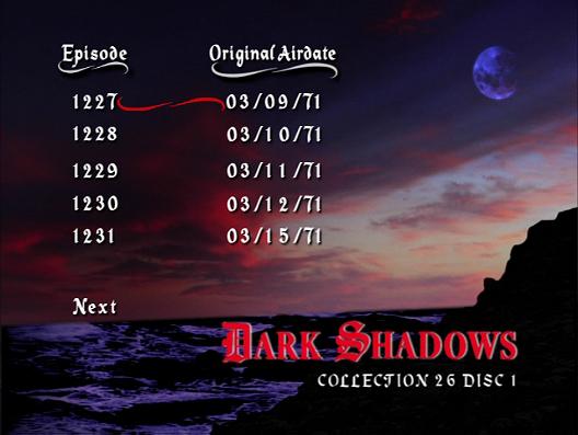 That is my favorite one because it's classy and I love to look at it. It's LOADS better than the mausoleum menu screen, which is my least favorite. And the first menu screen with the backdrop of Collinwood and the changing Barnabas faces is right there in the middle.