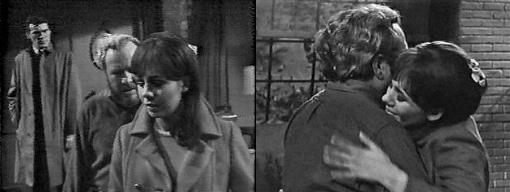 Roger himself appears on the landing, asking what all the racket is down there. Seeing Sam and Burke with Liz, his expression changes--he's scared. Burke walks up a few steps and says, "Hello, Roger, we've come to talk to you--both of us." Roger's face looks like that of a petulant little boy caught with his hand in the cookie jar.