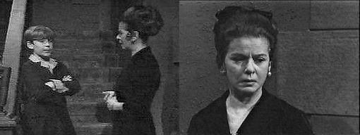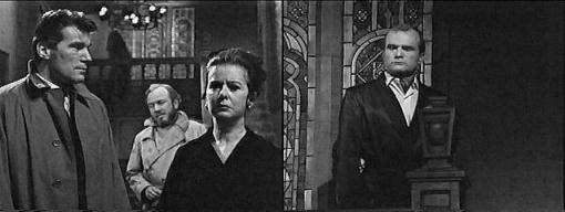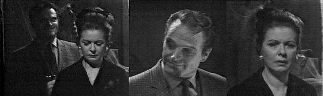Jason tells her he hopes her brother is satisfied--her invitation to stay couldn't have been more explicit. You must forgive Roger, she says, he's quite puzzled by it all. Jason forgives him. How generous of you, says Liz sarcastically. Jason says he would very much appreciate it if his stay here at Collinwood wasn't interrupted by these ugly scenes with him. We are not as you know a gregarious family, says Liz, surely you can understand Roger's resentment. He understands it, but doesn't enjoy it, says Jason--will you make sure he doesn't "express" it again? Liz rises from the sofa, walks over to him, and says she can tell him to stay when Roger tells him to leave, but she can't dictate his reaction to it. I suggest you try, says Jason. It wouldn't work, says Liz, Roger's one independent area is his temperament. I'm sure you could curb it if you really cared to, says Jason. Perhaps I don't WANT to, says Liz, cocking an eyebrow at him. Jason stares at his drink, saying, Liz, please, I like to enjoy my stay here--and I would appreciate it very much if you would really try, but I'm sure you'll do everything you can--for old time's sake. And his affable grin slips. He bids her goodnight, and when she doesn't respond, asks if she is going to wish him good night? She doesn't respond, and he repeats the question. Gulping as if she's swallowed something disgusting, Liz says, "Good night, Jason," not facing him. We hear a car pulling up outside. Liz stands alone, unhappy, angry, frustrated. She sits down. There's a knock at the door, loud. She goes to answer it, asking who it is. It's Sam. Liz opens the door (she can't see Burke waiting out there) and tells Sam it's very late. He must see Roger, says Sam, it's very important. Burke pushes his way in, and a startled Liz asks what he's doing here. Like the man said, we want to see Roger, says Burke. Liz says they can't, he's gone to bed. Would you be so kind as to wake him up, says Burke. I won't do anything of the sort, says Liz, trying to close the doors on the two men. Burke pushes them open, suggesting that she not shut the door. You have no business at Collinwood, says Liz, please leave! I have every business at Collinwood, very important business with your brother! Says Burke. Liz says this is ridiculous. Burke says he thinks she'll change her appraisal when she's heard them out. Sam assures Liz it's very important. What IS it? she asks. Go get Roger and you'll find out soon enough! says Burke. Liz tells the men she's had a very difficult evening. So have we, says Burke. Both men come into the foyer. If you want to see Roger, says Liz, arrange to see him in town at some respectable hour. They want to see him tonight, says Burke. Liz asks Sam to tell her what it is. Sam says it's really something between Burke and Roger. But Sam is involved, as you'll find out, says Burke. Liz asks if it involves those paintings of Sam's, they wouldn't come this late at night because of them would they? No, Sam says, not exactly. Please tell me why you're here, says Liz. Burke thinks she knows. Liz claims she doesn't have the slightest idea. Burke asks, really? No, she doesn't. I think you know, says Burke, now please get Roger.