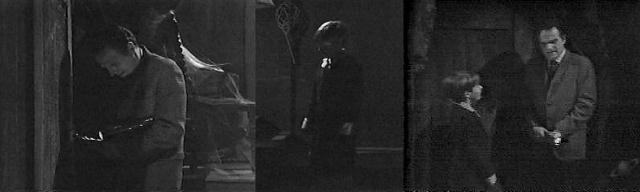 Drawing room - Say it, Roger tells Liz--you want me to leave Collinwood. She doesn't want to talk about it anymore tonight, she insists. He rises from the chair, and, gathering the remnants of his dignity, begs her to please not send him away, he doesn't know where he'd go or what he'd do--and think of David--what will happen to him, he is a Collins, after all. Liz angrily tells him people do things they regret for the rest of their lives. I couldn't help it, says Roger, I didn't want to kill him. Did you have to add cowardice and bribery to what you'd already done? demands Liz, you sent an innocent man to prison for five years! I couldn't help myself, please, begs Roger, try to understand. Liz can't talk about it anymore, please leave her alone! Silent, he gives her one more look, then, with a glance backward, leaves the room. Liz walks back and forth, hands clasped almost as if in prayer. She spots David heading upstairs. He tells her he's going up to bed, and she says he should have been there hours ago--where's Miss Winters? David says he doesn't know, probably looking for him. He's been around, walking through the house. Go ups to bed, she says. David asks if she thinks that the truth, facts, can be more horrifying than the mystery? Liz is puzzled. That's what Mr. McGuire said, says David, at first he thought he was relating (referring) to the locked door in the basement, but he thought he was just talking in general. What made you think he was talking about the locked room? asks Liz. That's where he found me, says David, just a minute ago, I thought he was trying to get into the room, but he said he was looking for me. HE was in the basement? Asks Liz. Yes, says David. Go up to bed, orders Liz. David says he's going, but Mr. McGuire seems to think the locked room in the basement is just filled with junk. Go to bed, she says, annoyed. David says he has a feeling Jason was trying to get in, maybe he wasn't looking for him, but he could be wrong.
