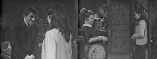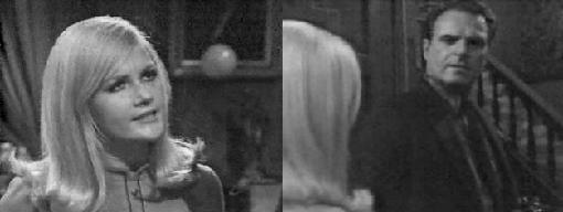 Drawing room - You must promise to come whenever you like, Liz tells Barnabas, you're not a stranger, you know, you're a member of the family. Vicki enters, sees the stranger and apologizes--she didn't know Liz was busy. Come in, please, invites Liz, I want you to meet a cousin of mine. Vicki stares at him, smiling, already knowing who he is. Yes, this is my cousin, Barnabas, from England, says Liz--Barnabas, this is Vicki--Victoria Winters--she's my nephew's tutor. Barnabas kisses her hand. I'm glad to meet you, he says, already entranced by Vicki. I don't have to tell you that Mr. Collins is a descendent of the young man whose portrait hangs in the foyer, says Liz. No you don't, agrees Vicki, you look so much alike. Vicki is more a member of the family than a tutor, says Liz. Do you let them call you Vicki when your name is Victoria? inquires Barnabas. Yes, she says, we're not very formal with each other. But the name of Victoria is so beautiful to me, I couldn't possibly surrender a syllable of it, he says. Vicki looks embarrassed. Forgive me, says Barnabas, but as I told my cousin, I indulge in fanciful attitudes from time to time; they're not to be taken seriously--and now, good evening. Liz offers to walk him to the door, but tells her he'd feel more at home if he sees himself out. He bids Liz good evening, then says, "Goodbye Miss Winters...Miss Victoria"--then bows deeply, smiling at her. He leaves, exiting the house.
