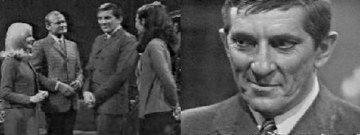 How affectionately Carolyn greeted Uncle Roger, home from a business trip! His comments about Willie, that the jet set can't be kept down, made me giggle. As she is telling him about their newly arrived cousin, Barnabas, invited in by Vicki, greets his present-day family. Roger's resemblance to his pop must have thrown him for a loop, huh?