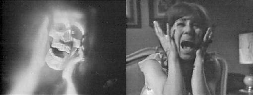 Old House - Barnabas is assuring Sam that his lovely daughter's future "is assured" as she tosses and turns, then has a terrible nightmare that she's wandering through a foggy glen-like place. She discovers a coffin, and, upon opening it, sees herself lying dead inside! She stares at her own dead body and begins to scream, and her face becomes that of a skull.