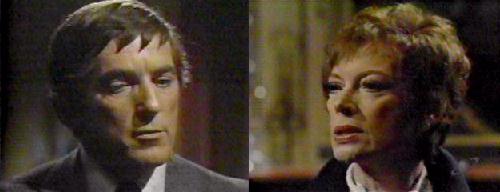 Or he could be dangerous and disturbed, counters Julia, but Barn insists Willie is no danger. Why do you want Willie released? asks Julia again, and Barnabas goes into a whole big speech about how Willie was shot down by the police, accused of murder, and confined to an institution--all because of him. Julia assures Barnabas he had no way of knowing Willie would try to warn Maggie, but even so, Barn feels responsible--this is very much on his conscience. Julia says, "Your conscience" in irony, and Barnabas retorts, "You say that as if you believe I don't have one--well, I do, and I want to clear it before I change my life." Julia asks if that's the only reason he wants Willie released. What other reason? asks Barn, and Julia says she finds it interesting he never had pangs of conscience about Willie or anyone else before. Barn asks if it's inconceivable he could perform an act of kindness. Everyone is capable, smirks Julia, but let's be honest, with you, it isn't, shall we say, characteristic. Barn insists he's been very fond of Willie, and Julia says he's also been very cruel to him. Impatient, (and I think he even stamped his foot), Barn demands to know if she's going to grant his request or isn't she? She can't answer now, she says, she has to see if it's practical or possible. Barn says it's both, and she wonders how he knows--he hasn't seen reports or visited Willie, so she finds his "conscience pangs" curious. Barn reminds her until recently, he couldn't function during the day to see Willie, but she says she could have arranged it--he never asks. Barnabas makes a determined face, and tells Julia he wants an answer. She says she'll call Windcliff and request a progress report. That will take several days, protests Barnabas, and Julia says that can't be helped. Barn says their own eyes and ears will be more effective--let's go to Windcliff, see Willie, and make our own decision, today. There's little time before Lang's experiment, and he wants to do this for Willie right now. It will only take a few hours--is that too much to ask? coaxes Barnabas. Unsmiling, Julia agrees, and they leave together, Barn gallantly helping Julia into her coat.