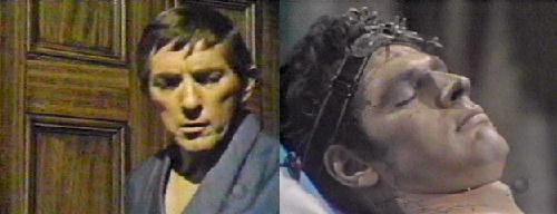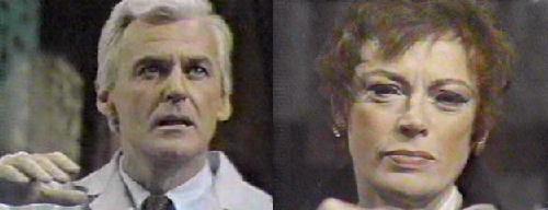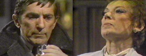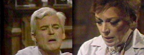 Lang grabs his chest. Julia says there's no more digitalis, and he tells her to get more from his desk downstairs. When she leaves, Eric takes his own pulse, and, finding it pretty weak, calls Julia again. She must know! he says. Fading fast, he turns on the tape recorder, (or thinks he does, another classic blooper), to record his voice. "Julia," he says, breathing with difficulty, "if you do the experiment again, if both Barnabas and my creation live--if they both live--Barnabas will be free and healthy as long as Adam lives. Adam will drain Barnabas' affliction from him, but will not suffer from the disease itself if he lives. But, if Adam dies, Barnabas will be as he was before."