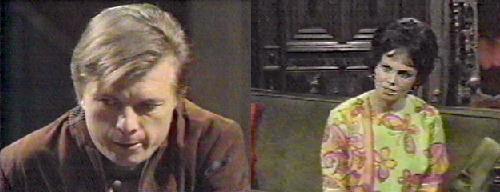 Cassandra is wearing the infamous butterfly dress as she answers Willie's knock, anxiously asking if anything has happened to Barnabas. He has a letter for Liz. She isn't here, says Cassandra. Willie says he can't give it to her--I don't know who you are. She introduces herself as Roger's wife--Liz will be back very late, adds Cassandra, asking him in--I've been alone all evening. Willie reluctantly enters, staring at her. She offers him a seat in the drawing room, and sits across from him. She talks about how absurd it is of Barnabas not to have a telephone--one would think he lived in the 18th century (dig, dig). She asks Willie if he's known Barnabas long, and he says on and off for a spell. Do you know him well? she asks. He chuckles meaningfully. They don't see much of him, he avoids them, says Cass. To stay inside that house all day long? He doesn't stay inside anymore, says Willie--he goes to see Lang a lot now (tightlipped). Cassandra speculates Lang and Barnabas are working together--that's impossible, of course. She asks Willie if he worked for Barn before his accident. Sure, says Willie, he was very different then. Sometimes, he's almost the same, comments Willie. Is he? asks Cass--interesting.