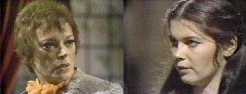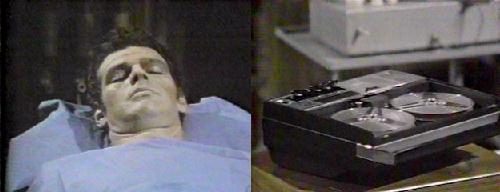 Julia shows Barnabas that Lang wasn't sure about the amount of voltage to use, and if she increases the voltage. . .there are so many unknowns, she frets, she can't comprehend. Barnabas suggests Lang was trying to tell her to increase the voltage, but she doesn't think that. He said there was a connection between Barn and the creation, and kept repeating "listen" several times. The tape recorder, she realizes, perhaps she is supposed to listen and hear his notes. She rewinds the tape and listens, hearing nothing but classical music. This isn't it, they realize, but what did Eric mean? She heads to the study to examine some journals, but before she goes, Barnabas remarks how handsome the creature is, and if by some miracle the experiment works. Adam has a handsome face, says Barnabas, to which Julia responds, sadly, "because of Vicki." Jeff Clark is younger, points out Barnabas, but Julia evenly respond that some women that wouldn't make a difference. Barnabas looks at her and she looks away, and he takes the trouble to tell her he appreciates everything she's done. He touches her shoulder and adds that, whether they succeed or fail, he wants to know how much he appreciates everything. Unable to deal with his saying that, Julia turns away. She's going to the study, is he coming? Yes, and right after they both go, the music on the still-running tape recorder stops and we hear Eric's final words about the connection between Barnabas and Adam.