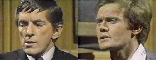 Lang's house - Barnabas stares at a clock. Where is Julia? he frets. They must do the experiment, each lost second is precious! He can feel himself reverting, it's going to happen unless they go ahead right away. If he becomes what he was, he'll lose Vicki forever. I need you, Julia! (sure, use poor, besotted Julia) Where are you? The clock relentlessly ticks on. 2:20. Barnabas plays with a lighter. He hears someone come in and sees it's Jeff. They each ask what the other is doing there, and Barnabas says he was helping Julia sort out Lang's belongings. Jeff says he came there to get something, and barges past Barnabas, who says Jeff has no right to be here. Jeff says he has as much right to be there as Barnabas. Perhaps, says Barn. Jeff asks him to give him a few minutes alone in the living room. When Barnabas refuses, Jeff pulls out a pocket knife and begins breaking into a filing cabinet. Barnabas demands to know what he's doing--this belongs to Lang and he won't let Jeff steal from him. Barnabas grabs Jeff's arm, wanting to order him out, but Jeff insists he has to do this. Get out, orders Barn, but Jeff tells him he's going to have to throw him out. Barnabas says he isn't strong enough to fight him, unfortunately, and Jeff says to leave him alone then. Jeff succeeds in opening the cabinet; Barnabas asks what he's looking for. Records about me, replies Jeff--Lang withheld information I needs to know. Turning honest, Jeff tells Barnabas he was in a mental institution. Barnabas knew this, Lang told him. I had amnesia, says Jeff, and Lang kept my life from me--I need that information. Barnabas watches Clark search the file. Jeff smiles, big. He did find something, he tells Barn, and it's good news. Barnabas caustically asks if Jeff is returning to Collinwood to share his good news with Vicki. I just might, responds Jeff. Leave her alone, orders Barnabas. Jeff asks what gives him the right to say that. Concern, says Barnabas--I'm very fond of Vicki. Jeff says he is, too. Barnabas doubts Jeff could make her happy--he's apparently very unstable. Jeff denies this. Barnabas defensively says all Jeff has to offer Vicki is his handsome face--and Vicki needs more. Jeff calls Barnabas transparent--he knows Barnabas is jealous, don't deny it. Barnabas won't deny anything. Jeff knew Vicki was going to marry Barnabas and changed her mind, and while he can't do anything about that, he can tell Barnabas to stay off his back. Barn threatens to tell Vicki about Jeff's contribution to Lang's experiment, and Jeff reminds him he can turn the tables on that score. Barnabas frowns as Jeff tells him to face the facts--he and Vicki are falling in love, there's nothing he can do, so leave them alone.
