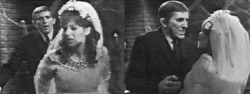 Cruelly, Barnabas says that she deserves to die, painfully, slowly, so that when she does die, it will be a merciful death. She'll die lifeless--and bloodless! Maggie cringes and cries out at these cruel threats, and even though the vampire warns Willie that he no longer needs him, either, he starts talking rapidly (his performance is stellar here). Look at how pretty she is, Willie babbles, you wanted her for your bride, give her a chance! Barnabas turns away, not wanting to look at Maggie, but does turn back. Barnabas drags the protesting, struggling Maggie away, leaving Willie alone, and locks her in a small, dank cell in another portion of the basement. She'll stay there until he makes his final decision, he informs her harshly.