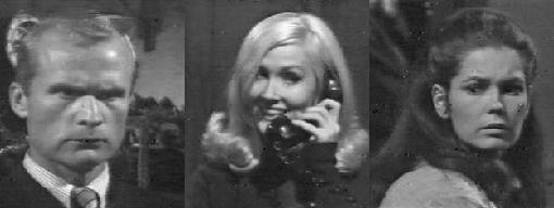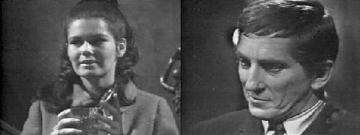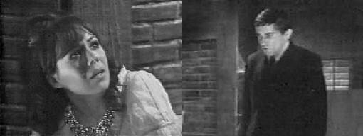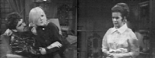 Buzz pulls up in front of Collinwood's front door (neither wears a helmet). He wanted to go around to the back, but she'll have none of that for her new beau! He says they "swing" well together, and they smooch hungrily. He refuses to go inside at first, but she drags him in, and he's impressed by the place. He says he'd love to drive his bike right up Collinwood's staircase and Carolyn tries to talk him into doing so, but he at least has enough smarts not to do anything that foolish. They go into the drawing room, drink some more, and dance to a transistor radio; then Buzz sits and watches Carolyn gyrate for a while. Liz comes downstairs, horrified that Carolyn has come home at 3 AM (isn't that when all the good stuff happens at Collinwood?). Carolyn introduces her to Buzz, who calls her "Mommy," grossing Liz out.