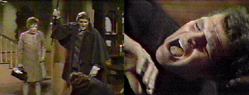 Say it! Demands Willie, as Adam continually reaches, fruitlessly, for his chicken. Adam frees himself from the leg chain and comes after Willie. Willie tries to lock him in, the entire wall shaking, but Adam escapes and pursues Willie. They reach the front door, Adam menacing Willie. Barnabas and Julia return to the Old House. She tells him she won't let him stay alone, he's too depressed. He feels he has a right to be, given his guilty load. Then enter the house to find Adam strangling Willie. Barnabas orders him to let Willie go, but Adam doesn't, he's had too much taunting from his pseudo-brother. Barnabas tries to drag Adam away, raising his cane over Adam, beating him with it.