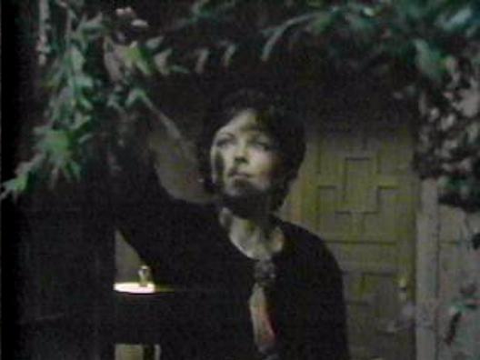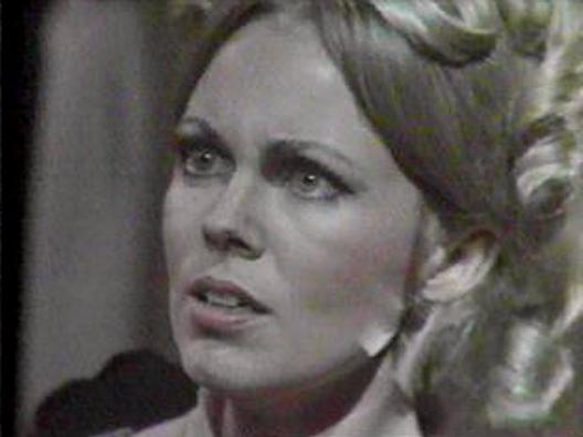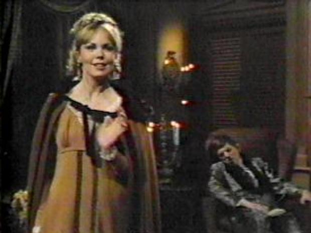 Drawing room - Cassandra, in a black velvet cape, tells Barnabas the time has come. His fate was sealed almost 200 years ago, and he can't change his destiny or permanently escape. The curse will fall back on him, forever, she promises. "Let the dream curse begin this night," she says, "it will be carried by the wind until it finds its way to someone who is the image of one you loved--go deep into the sleeping mind of Maggie Evans, and she will be the first to know the terrible fear it carries with it." Cass takes a leaf from the tree outside the window and tosses it. "Sleep, Maggie, sleep," she murmurs.