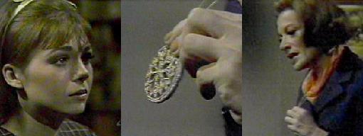 He saw a glimmer of recognition on Maggie's face, and he's going to kill Julia first, then Maggie. She moves away from him, circling the entire room to escape him before the phone rings and she hastily answers it. It's Dave, Maggie's with him, remembering everything. Julia says to keep Maggie there until she gets there, clear everyone out, and not question Maggie about anything. Meanwhile, Maggie is starting to rapidly blather everything that's coming back to her--Sam, her home, Sam's painting, being held prisoner, in a room, by a man with dark, burning eyes, who wants to kill her. Dave is trying desperately to get her to swallow another sedative, to quiet her, but the words are pouring from her lips. Julia arrives just in time to prevent her from naming her kidnapper. She feigns gladness over Maggie's returning memory and sends Dave out of the room, to his consternation. She takes a medallion out of her blouse and shows it to Maggie, who reveals to Julia that Barnabas Collins in one of the undead and did horrible things to her.
