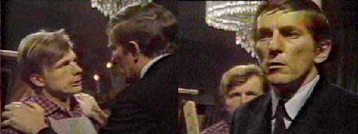 Burke and Barnabas emerge from the drawing room and assure Vicki all is well with them. She sees Burke to the door and tells him she's proud of him. The camera angle is such that we don't see more than the back of her head when they kiss, which is a relief.