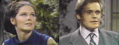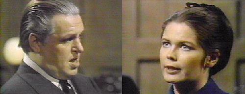 Jeff can point out all his disadvantages--not knowing who he is (and he might never know). Vicki knows all this. He wanted to wait until he learned more about himself, but that could take a long time--he wants her now--who does she love, Peter Bradford, Jeff Clark or both? Both, she replies. I love you so much, says Jeff passionately, and I don't know why you loves me, but I don't want you to stop. They kiss some more. He promises to change--he wants her to have everything. He opens a ring box and says it isn't what he wanted to give her (so why give it, you fool?). She says it's beautiful, she loves it. It's old fashioned, and reminded me of you, he says. She asks him to put it on her, and tells him which finger. He does (it's a light blue stone), then they kiss. (Alex Moltke doesn't kiss with as much fervor as Roger Davis does.) He tells Vicki he has a terrible fear something will happen, he might lose her, but she assures him that won't happen. Adam watches them, observing their technique.