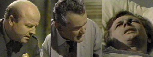 Barnabas looks angry and crestfallen when the Sheriff brings him to the hospital and orders him to wait outside in the hallway while he questions Willie. Urbanely, Barnabas tries to explain to Patterson how much better it would be if he, Willie's employer, questioned the patient first.