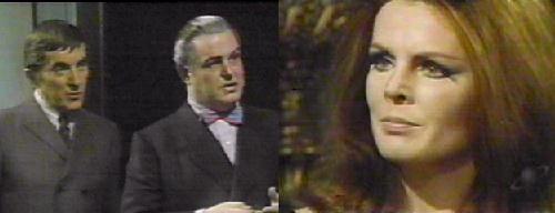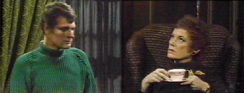 How can I not? she counters--I have no choice--I open my eyes and I'm here, in this house. Stokes refers to her as "Mademoiselle," and she asks what he means by that. Stokes asks to be left alone with Eve. Adam assures her it will be all right--and remember my warning, he says, exiting. Stokes and Barnabas sit down. The latter explains that the experiment that produced her was responsible for the creation of only one other person. "Adam," she guesses disdainfully. (Mike R Phone in shot.) Barnabas says they're curious as to why she isn't as Adam was, and she asks if they would prefer her helpless. Not at all, says Stokes, but they are interested in her claim to come from another time and place. She doesn't remember saying that, and Barn insists she must. Eve asks how can she remember when she has no memory or existence. Barn asks how she can speak without a memory. Stokes suggests English isn't her native language--he thinks French is. Eve doesn't know what that is. Barnabas wonders how she understands everything they say, yet doesn't know one of the world's principal languages. Stokes offers to provide a few names to jog her memory. I'd like that, says Eve. Barn asks if she's remembered anything since coming into the room, and she says no. Stokes says, "Guillotine. Marie Antoinette. She thinks the name is pretty, but it doesn't ring a bell. Danielle Roget, says Stokes, getting down to business. Eve gets annoyed and says they'll be asking her next about Leona Eltridge--Adam seemed to think the name would mean something to her, too. She finds them and their questions strange. Barnabas thinks it odd SHE has so few questions. She asks if she will stay here. Stokes turns to Barnabas, and there is no answer. When will it be decided? she asks. Stokes asks if she wishes to leave--and where she would go? She's pissed they aren't answering her question. "I am used to my questions being answered!" she says. Barnabas jumps on that, demanding to know WHEN she was used to that? She doesn't know, she says, suddenly upset--what do you want me to say--tell me, I'll say it!--you gave me life, you must have a reason--tell me what to do and I'll do it, but I want to talk no more.