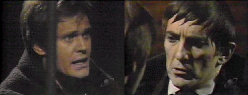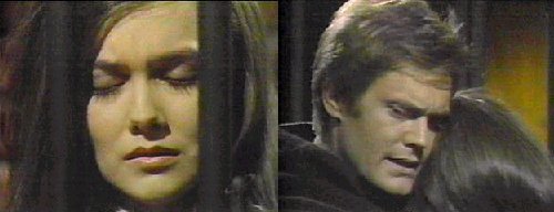 Peter and Vicki sit on the bed in her cell, where she tells him that, before, when it happened, she managed to escape. "What?" asks Peter. That was because there was someone to take my place, says Vicki, now there's no one. Peter says he doesn't understand, and she tells him not to listen to her, gazing at him with love. Peter tells her not to say anything else, just to let him hold her. They hear someone coming. He assures her he loves her and kisses her deeply. Barnabas enters the cell. Listen, he tells them--I can save your life--follow my instructions: "Go to the gallows," orders Barnabas, shocking Vicki-- you'll be safe if you do everything I tell you to do. Peter looks unhappy. Vicki agrees. First, Barnabas tells her, refuse the hangman's mask--second, you must not panic, be afraid or ask questions, because something unexpected might happen--IF you do as I tell you, no harm will come to you--trust me. I do, Vicki assures him. They arrive to take her for the hanging; she clings to Peter. Remember what I told you, says Barnabas. She stands. Barnabas is forced to watch as Vicki and Peter embrace and kiss. I love you, says Peter. The jailer separates them and orders her to come with him. Peter and Vicki look longingly at each other as she is taken away. I love you and will find you, no matter what happens, Peter assures her. They kiss again (a good kiss), and he says one more, "I love you." Barnabas pulls Peter off Vicki--there's nothing YOU can do, only I can help her, says Barn. Peter turns on Barnabas, saying he had Forbes' confession before, but he doesn't have it now, and Vicki is on her way to the gallows!
