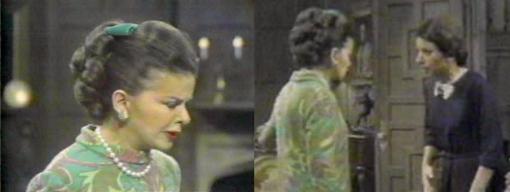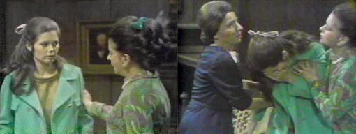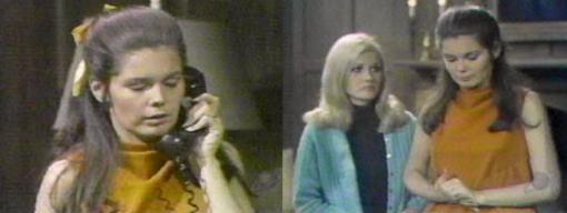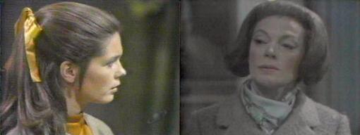 Julia is alone in Josette's room, sitting at her dresser, touching her brush and comb, musing over Barnabas' obsession with this woman, trying to fathom why. She talks to herself--why can't this dead woman STAY dead and buried? Julia hears a sound and demands to know who's there. She must be scientific about this Josette business. Sensing a man's presence, Julia calls out, "Dave?" She's relieved to hear Vicki calling her from downstairs and shouts for her to come up. Julia doesn't deny that she's doing research on Josette. Vicki says she's decided to restore the West Wing--and take up Barnabas' offer to help her. Julia turns belligerent harpy and says EVERYONE is always bothering Barnabas, taking advantage of him, but he's a busy man! He prefers to be left alone, Julia insists,
