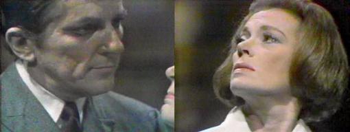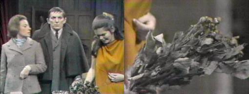 Barnabas pays Vicki a visit at Collinwood and feigns distress over her not hearing anything about Burke. Vicki relates to Barnabas the odd conversation she had earlier with Julia, but Barnabas, clearly angry, assures Vicki he didn't offer to help with the east Wing out of kindness--she's dear to him! Vicki says Julia's attitude was peculiar, is she working too hard, perhaps? Not to worry, Barnabas assures her. Julia comes in at this very moment, bearing beautiful yellow flowers for Vicki, a token of apology for her treatment of her earlier. When Vicki leaves to get a vase, Barnabas, his tone furious, grabs the flowers out of Julia's hands and tells her that he KNOWS hard work isn't the explanation for her outburst. They are nothing but doctor and patient, no matter what her delusions to the contrary. No matter what your delusions, retorts Julia, we're more involved than that. Because of Woodard? Barnabas asks. Control your feelings, Barnabas advises, and be nice to Vicki. Julia gazes at him, tight-lipped. When Vicki returns with the vase, she is dismayed to find the flowers are dead.