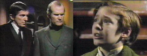 Tell Roger the truth, urges Barnabas. David tries to tell his father he has dreams that make him scared to go to sleep at night--I want to spend the night at the Old House. Barnabas advises Roger to allow it. Reluctantly, Roger agrees. Barnabas assures him it won't inconvenience me--and I must report to Collinwood for breakfast! (Lucky Barnabas doesn't sleep in a coffin anymore, that would be difficult right now.) Roger thanks Barnabas before he leaves, commenting, "What a night!" Barnabas returns to David, who says he wants to go to bed. Barn wants to finish their conversation--who drove you from Collinwood? Promise me I can stay at the Old House forever, pleads David--or else I don't know what will happen--I didn't mean to start it, it started as a game. Barnabas encourages him to keep talking. David describes the night he was showing Amy around the house--Quentin's appeared at the window, staring directly at me! says the boy. Barnabas can't see the ghost. David stops speaking immediately. "It was only a game," he says, we were just playing--they'll punish me, he says--I don't know what to do! David runs upstairs, sobbing, and Barnabas stares up at his retreating figure, his face shadowed with concern.