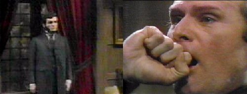 NOTES: DARK SHADOWS at its absolute best! Louis Edmonds' performance here was incredible, first as the doubting Roger, then the Roger forced to believe. I love his "We'll be back!" Much better (and spoken many years prior to) Arnold S'. It rarely gets any better than this, my friends, does it? Loved the proprietary way Quentin takes over the house, too, filling the whole place with his cruel laughter and music. It makes my heart skip a beat every time Liz and Roger leave Collinwood. Very powerful television!