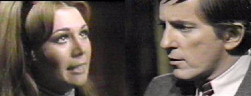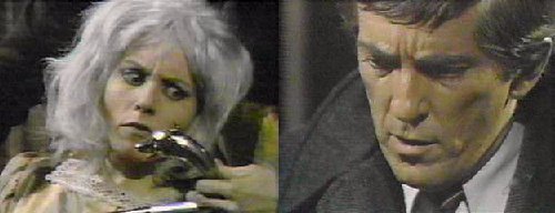 Since you're such a good friend of Chris', Ned says belligerently to Barnabas, perhaps you can explain him to me. That's not the reason I'm here, says Barnabas, and I'm not here to defend Chris. You couldn't after that phone call this morning, says Ned--how could any man be so callous as to send someone else in his place?--I suspect he's scared and I'll find out what he's afraid of. Barnabas advises him to spend his time seeing to it that his sister gets proper medical care. We've gone to doctors, says Ned. By staying here, you're making your sister's life difficult, points out Barnabas. Ned insists it's necessary. I realize it's a tough situation, says Barn, and tragic, but the truth is, Chris is in love with my cousin, and one of the reasons he doesn't want to see you or Sabrina. "He goes on living," says Ned bitterly, acting as if this never happened, a little embarrassment along the way. Ned offers to introduce Sabrina to Barnabas--she was beautiful--once! Ned wheels out Sabrina, introducing her as a friend of Chris'. "She can hear," cries Ned--"She CAN hear!" Barnabas is clearly shocked, but says urbanely, "How do you do, Sabrina?" to her. Do you think your cousin will end up like this, Ned asks. Barnabas, uncomfortable, walks behind Sabrina. Ned asks if Barnabas can look at her. Barnabas says this is the kind of scene his sister should be avoiding in order to have any peace. Sabrina looks out the window and spots the full moon. "Look at her," says Barnabas--you have made her life so difficult. Ned touches Sabrina's shoulders and says if the only way I can make her remember is to shock her out of it--then that's what I'll do. Barnabas calls him cruel. Ned, dropping a kiss on his sister's forehead, says, I won't have any life until my sister has one--and you can tell Jennings that! I think Chris already knows that, says Barnabas, who bids Sabrina a courtly goodbye and expresses his sorrow that she doesn't realize her staying here is a bad thing to do. Sabrina reacts with horror at the sight of Barnabas' wolf's head cane.