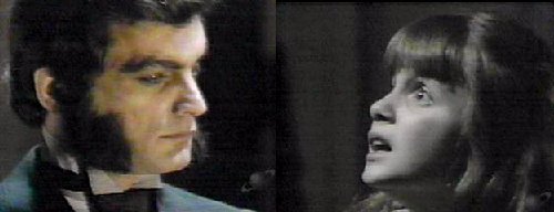 Maggie describes how Quentin appeared, and that's all I remember--no, I looked up into his face, he was so cold and evil, I begged him to let them go, but he. . .he touched me--his hand was so cold, it chilled me all over--he didn't speak to me, I'm sure of that, he called me by another name, a name he chose, that made the clothes seem right--I can't recall the name, it's like a dream, I can't remember anything! Barnabas and Willie found the dress there earlier, but it wasn't in Quentin's hand when I saw him. Do you remember where he took you? Asks Barn. Maggie suggests they ask Amy, she might know the answers. Barnabas says no, she's completely under Quentin's possession; her mind is with him. Maggie fearfully wonders if he was able to do this to her, what has he done to David? The front door opens. It's Roger, who turns on the light and announces that he isn't leaving the house until he finds David. Roger is shocked to see Maggie in the Victorian duds, but Barnabas quickly explains that they have no explanation for it--she was here in that dress after seeing Quentin, but remembers nothing else. Roger anxiously asks if she saw David; she shakes her head. Roger orders Barnabas to take Maggie back to the Old House--I won't be alone long, because I called the police!--I wonder what I'll say--that I was driven from my own home by ghosts--they'll think me mad. Roger feels they need the cops to thoroughly search they house, even though Barnabas assures him they already did that. Maggie begs Roger not to stay here, but the latter says he must make the decisions now and she should go with Barnabas. Roger encourages Barnabas, who wants to return to Collinwood after leaving Maggie at the Old House, not to return; she might remember something important. Barnabas leads Maggie away. When Roger picks up the phone, Quentin's music starts. Roger retorts, "That music doesn't scare me!"--and challenges Quentin to show himself to him. When Quentin doesn't appear, Roger begins to dial, but then a book opens by itself on the desk. Roger walks over and picks up a piece of paper that says DAVID IS MINE. Roger crumples it. "He is not yours!" he shouts--I am going to find my son and keep him from you, Quentin--forever.