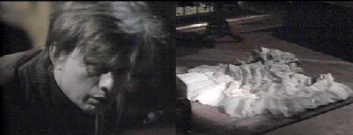 He does find the blue dress on the floor, which Willie bends to pick up, then says, "I feel someone watchin' me. Barnabas chides him for an overactive imagination, saying I hear no spirits. Willie lifts the dress, which Barnabas recognizes as Victorian--we won't take it, he says. Willie asks Barn how they'll find the kids--they'll only run from us if they are possessed. We must hope there is still a faint desire to escape this house, answers Barn. Amy listens to this, scared. She starts to leave the alcove, as if to go after them, but Quentin's music begins to play, and she steps back into the hiding place. Barnabas and Willie hear it, too, and wonder where it's coming from and why he wants them to hear it. He must want to draw us away from something, says Barnabas. That dress, suggests Willie. Barnabas trains his flashlight around again, missing Amy a second time. The music stops. The men head upstairs. Willie nearly has apoplexy as the lights flash on by themselves. We're dealing with spirits, Barnabas reminds him--Quentin is laughing at us--we'll just have to live through it, Barn tells Willie, who stares around, petrified. They enter the landing door.