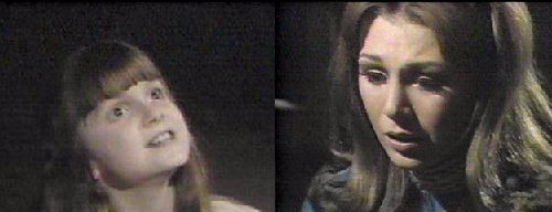 "I live here," says Amy--David and I belong here now, and we'll have so much fun and be so happy--you don't know what it's like. Maggie kneels down and begs the little girl to please come with her. No! protests Amy. Maggie tries to drag her out. We see Quentin's shadow approaching, walking downstairs. Maggie is attempting to convince Amy that Quentin is trying to harm her and David. I don't believe that, says Amy. Maggie suddenly becomes scared, feeling a presence--where is he? The fireplace, maybe, teases Amy. Maggie looks over there, and is about to take Amy out when Quentin appears before them. Maggie screams, backing away. Quentin closes the doors and balefully surveys Maggie. "Stay where you are!" Maggie insists. Amy assures her, he just wanted to see you. Why? asks Maggie, turning to Quentin--give us David and let us go! Quentin slowly shakes his head: no. Amy tells Maggie not to be afraid of Quentin as he advances on them. "Don't touch me!" Maggie screams, pulling Amy back with her. In the West Wing, Barnabas and Willie hear her screams and race to her aid.
