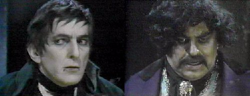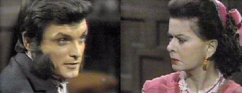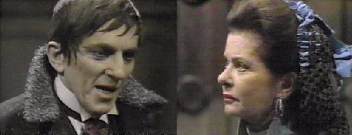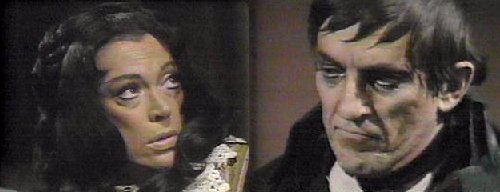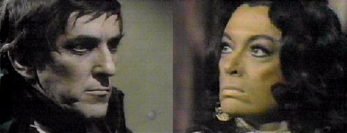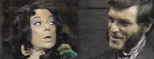 She rubs her hurt arm--why did you come here? she asks. That's your concern for another time, says Barnabas--your present concern is to protect me during the day. She doesn't comprehend why he's so trusting--during the day, when you're vulnerable, I could come to your coffin and destroy you. Yes, agrees Barnabas, but you won't--when your husband found me earlier this evening, he was looking for the family jewels (go ahead, laugh!), wasn't he? Right, says Magda. I know where they are, says Barn, eliciting a big grin and gleaming eyes from Magda, who agrees to make "some arrangement." On MY terms, insists Barnabas. What are your terms? she asks. Cooperation, says Barnabas, and I will give you a small, valuable part of the family jewels. He shows her a big ruby ring, which she runs lovingly across her lips. One jewel? she asks, unsatisfied. There will be more, promises Barnabas, as long as you uphold YOUR end of the bargain. She assures him, as she plays with the ring, and tries it on, that he may consider his secret safe with her and her husband. Barnabas is pleased, but offers one word of caution--do not let your greed get the better of you. She assures him they won't betray him. Barn turns the conversation to Quentin--why he is so anxious to learn the family secrets? Everyone does, says Magda, explaining that she is the spiritual advisor to Edith Collins--although she admits she isn't privy to the secret, either. How does Quentin stand with Edith? Asks Barn. She knows he's bad, but he charms her well, says Magda, gazing into her crystal ball. Is Quentin dangerous? asks Barn. Very, says Magda--why are you so curious about him? I must learn everything I can about Quentin by tomorrow night, when he will be at Collinwood, says Barnabas, and they will be receiving a strange visitor--a distant cousin from England. (oh, that old ploy!) Barnabas smiles triumphantly.