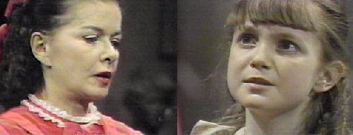 You can't, says Judith--she isn't strong enough. Edward and I listened to what the doctor said, explains Judith. Daddy didn't hear from the doctor, says Nora. (oops, caught, Judy!) Gently, Judith tells her, you and Jamison must try to forget your mother. We both tried writing our mother, says Nora, but we know the letters never mailed, because we found them in Daddy's desk--you won't let us write to her, or answer any of our questions, wails Nora. When you're older, says Judith, you'll realize there are questions for which there is no answer--now go upstairs to bed; you get cranky when you don't get enough sleep. Reluctantly, Nora goes upstairs, Judith right behind her. We see the woman's slippers and black hem of her dress as Nora complains that she won't be able to get to sleep. Judith assures her, you're more tired than you realize. Nora asks if she can stay in Rachel's room tonight, but Judith pronounces that a bad idea. The woman enters a room--Edward's, and we see a wild-haired redhead retreating behind the curtains. You never let me do anything I want to do, Nora complains to her aunt. They arrive at Nora's room, and she's surprised to see the door is open. Judith figures that's how she left it. No, I didn't, says Nora, I closed it. Nora is nervous about this, and Judith basically tells her not to let an open door scare her--a draft probably blew it open--there's no one on the house that shouldn't be here. Judith follows Nora into her bedroom and asks the child if she said her prayers. Yes, says Nora, who climbs into bed and pulls the covers over herself. Judith kisses her goodnight. Nora asks her not to leave--I'm frightened--she asks Judith to stay just a little while; if you leave, I'm sure I won't get to sleep. Judith sits beside her and tells her to close her eyes. Behind the drapes, the wild-haired, wild-eyed woman in a black dress caresses what looks like a Raggedy Andy doll that is very out of place in 1897. Lightning flashes over her face.