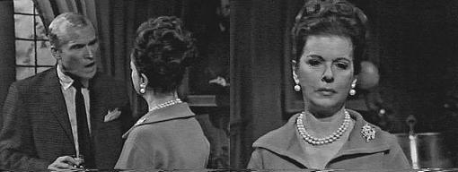 "You lied to me, didn't you?" she reminds him coldly. He asks if they have to stand in the hallway discussing this. She says she doesn't care where they discuss it, and he says, gesturing to the stairs, "There are ears in this house, primed to pick up tidbits of information." They're alone, she says, unless he is including the ghosts from his past, of course. "Very well," he says harshly, "I and my ghosts want a drink! My nerves are shot" He turns around and marches into the drawing room. Liz, shrugging her shoulders, follows. Roger quaffs his drink. Liz clasps her hands together and said, "You distinctly led me to believe that you were to meet Bill Malloy on a business matter alone." Roger, his mouth working, looking very uncomfortable, asks if he denied anyone else was present. "Omitting the truth is the same as lying," Liz asserts. Why must she jump on every little thing so vehemently? he asks. He had reasons for not revealing that Burke and Sam were at the meeting. Explain these reasons, she demands, and he says, "I did it because of you." "Because of me?" Liz asks incredulously. He knew she would be upset by it and didn't see any point in bringing it up until he learned from Malloy the purpose of the meeting and why he didn't appear at it. Liz finds it hard to believe that Bill called a meeting consisting of himself and the others and neither Roger nor the others were aware of what it was for. That's precisely right, Roger insists. Liz wants to know what Burke and Sam thought, and Roger says they were as mystified as he was. "Oh, Burke exploded all over the place," says Roger disdainfully, "he pretended to think the meeting was supposed to reveal something about his manslaughter charge." Perhaps that's what the meeting was about, Liz suggests. "Bill told me that even though I disapproved, he was going ahead with some plan to prove Burke innocent." Roger, irritated, voice rising, says, "Liz, I have told you again and again that all the evidence was brought out in the trial!" That's what she told Bill, Liz says, but he seemed to think he thought he could uncover something new. Shouts Roger, "I'm tired of defending myself! I will tell you now, outright, that it was a pack of lies!" Bill wouldn't lie to her, insists Liz, and Roger claims, "Then he's been repeating lies that have been told to him. Don't you see that Burke Devlin is out to murder me--he's out to DESTROY me!" "Bill said he had some evidence that could set aside Bill's conviction," Liz says. "LIES, all LIES!" Roger cries, his features a twisted mask of fury as he gets right into his sister's face. "If you can ever accept that premise, then you will believe me! You've GOT to believe me!"