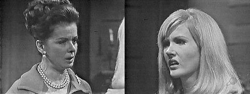 Maggie carries a cup of coffee and an order of buttered toast from behind the restaurant counter and embraces her father as she places both in front of him. She asks him what he had on his mind when he came in. He asks about the letter he gave her--she put it in the hotel safe, right? Yes, she did: "You told me to keep it in a safe place, what's safer than a safe?" He says he was thinking about it and has decided the latter itself isn't that necessary. Why not, she asks, and he explains that it's served it's purpose whether it's there or not--the important thing is, somebody knows that letter exists. "Who?" soberly asks Maggie, and Sam sucks on his cigarette, turns away from her, and says, "It doesn't matter." Shaking her head, Maggie walks over and sits down opposite her father. She leans forward earnestly, puts her hand on his arm and asks, "Pop, now who would want to harm you?" He can't tell her, it involves others. Maggie asks if this person knows SHE has the letter, and Sam replies, "Of course not, if he did, why..." He stops, seems to suddenly remember who he's talking to. "No, no," he continues, "I didn't mention you at all, but just to be sure, you go and ask the clerk to give it to you, and then you give it to me--you'll do that for me, will you, Maggie?" "I don't think I will," Maggie says defiantly, shaking her head. "Maggie," I'm asking you," Sam says--"Go to the lobby and get me that letter!" Maggie orders, "First you tell me why." He says he told her why. "You haven't told me one single thing!" Maggie says shrilly. "You're in some kind of a mess--what kind, I don't know!" "You don't have to know," Sam insists, "give it back to me and forget all about it!" Brow furrowed, Maggie says. "Forget it? Forget the way you've been acting since Burke Devlin came back to Collinsport?" Face softening, she adds, "Forget that you're my father, that I love you?" Rubbing his forehead as if it hurts, Sam says, "Just get me the letter." Maggie rises, stands behind Sam and gently places her hands on his shoulders, saying, "Pop, you said you were afraid that something might happen to you. Well if it did, and something happened to you, I'd never know what it was all about! I'd never know who" (she hesitates as if afraid to say exactly what she was thinking and lamely finishes)...who might want something to happen to you." "Maggie, you're holding a pistol to my head," Sam protests. She gently tells him not to worry--SHE isn't going to pull the trigger. "You might trip and pull it by accident," Sam predicts morosely, glancing up at her.