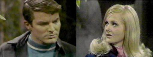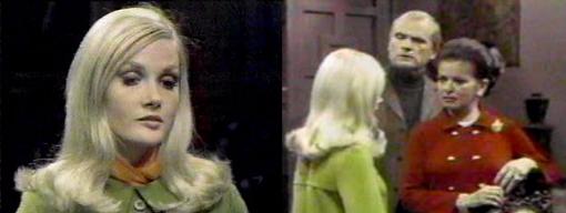At Collinwood, Joe tells Vicki that Carolyn seemed weird, remote--she wanted to get rid of him. Perhaps it's her worry about David, they decide. Barnabas comes to the door and Vicki lets him in, but it's apparent she isn't that happy to see him. Joe leaves for a date with Maggie, and Vicki almost seems prepared to beg him not to leave her alone with Barn. Barnabas offers to finance a private search party for Burke, which draws words of gratitude from Vicki, who turns him down because she believes the authorities are doing everything they can to find him. Barnabas wants her to be happy, anything she wants, all she needs to do is ask. He takes her hand, but Vicki, repelled, pulls it out of his grasp, then instantly apologizes for doing so. He suggests perhaps she'd rather be alone, and while her lips deny it, her eyes say something else: LEAVE!!!! Barnabas turns to look at Vicki as he's leaving, and she won't even turn around to look at him.