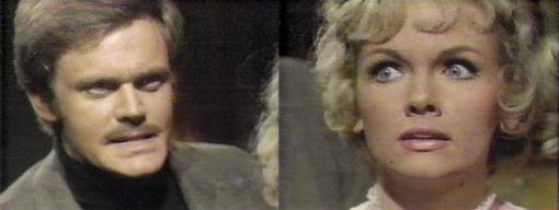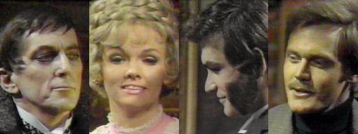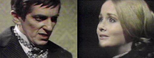 NOTES: Some not very fancy special effects here. Love the kinky scenes between Dirk and Laura; all this talk of heat, body and otherwise, is cool. Poor Beth, does Quentin love her enough to do what he promises? She's apparently keeping her part of the bargain--and keeping Quentin safe from Jenny and vice versa. But to what cost to herself? Barnabas loves taking Charity away from her daddy-Trask, which is really nasty of him, but can you blame him? Barn just loves his little power plays over his victims, and it was funny, how Charity objected to being at the Old House until he gave her a little vampire lovin'. Frid's recitations were marvelous, his face alight, his voice, as always, magnificent. We saw some nice kisses from Beth and Quentin, that passionate "necking" between Barn and Charity, and even a little Phoenix love for Dirk from Laura.
