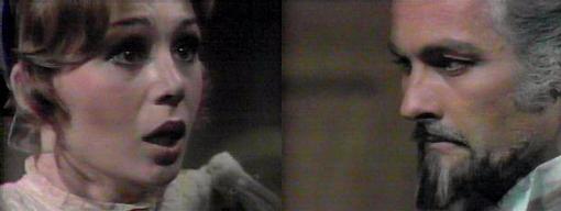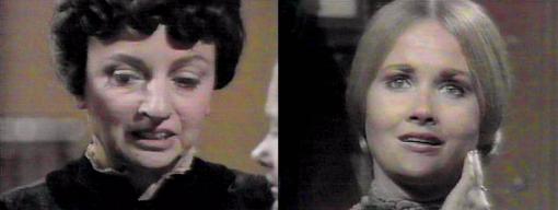 Charity drinks tea in another room, demanding of Rachel, how can you fail Allison Ainsley (?) in sewing? Rachel, a ledger book in hand, says, she hasn't finished one thing I gave her to do. Well, says Charity, Allison, a banker's daughter, came highly recommended. And I told her I'd fail her if she didn't finish the bonnet--and the girl chose not to, says Rachel primly. We can't send a failing mark home, insists Charity--let's give her a D--don't sulk about it, I know that look on your face. I want to finish the report, says Rachel. You're in a hurry, Charity notes--do you have permission tog out this evening?--you certainly didn't waste much time, notes Charity--I knew he'd come to you first thing, but I want you to know that I broke the engagement. I have no idea what you're talking about, says Rachel--Tim told me nothing. He will, says Charity, and probably propose to you--I think the two of you might be able to be happy, and work out the problems you each obviously have. (whatta bitch!) I want to get back to the grades, says Rachel. Charity, however, goes on, undeterred--Tim isn't ambitious enough for me--if you want to spend the rest of your life teaching at this school. . . You have other plans? asks Rachel. Yes, or at least Mama has, says Charity, and I wouldn't be at all surprised if my life were to change completely--imagine, having closets full of beautiful dresses, jewels. . .father wouldn't approve, but if he were living at Collinwood, he might, realizing I had to keep up a certain position--Mama would make him realize that.