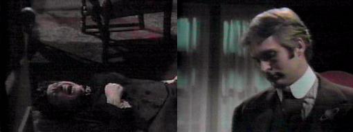 Barnabas, frantic, notes that beside the fang marks, there is a rope around Pansy's neck (which wasn't there at the end of the previous Episode; they want us to believe she was strangled, not bitten, to death), and locks the door. When Carl knocks, begging to talk to Pansy, Barnabas stands there, the corpse in front of him, trying to figure out how to handle this.