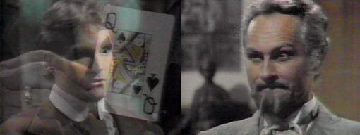 Charity's mother lies in her chair, still alive, moaning. She opens her eyes and sees Tim. You did this to me, she accuses--why? You played the Queen of Spades, he tells her. "Murderer!" she calls him, finally sinking back in her chair, dead. "I had to," he says, as if it were the most obvious thing in the world, "you played the Queen of Spades--he told me when you played the queen, it would happen." The door opens; Evan Hanley walks in. "Who told you, Tim?" he asks, assuring him, it's all right--I will help you--this is like an experiment; it's as if we are in a laboratory, and we must remain very clinical. Evan checks out Minerva, taking her pulse. He glances at Tim and says, "You did well." Evan takes the Queen of Spades and tells Tim, look at me, straight into my eyes--I can see you're troubled by what you've done, but I am going to help you again. Tim looks away. Evan orders, don't take your eyes from mine. . .do you want my help, Tim? Tim nods. This is the Queen of Spades, he says, showing him the card, and when you carry it out, you will remember none of what has happened, you will forget all the visits you paid to my house, the talks we had, the plans we made, you will forget all about Mrs. Trask--you want that, don't you, Tim?