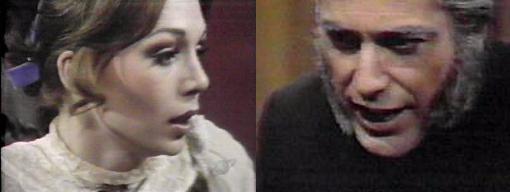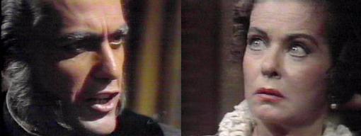 NOTES: Well, doesn't Dirk make a fun vampire? Not too much tongue, but he does love opening his mouth wide so we can admire his BIG fangs! He wants to play servant/master with Judith, and I bet she got a thrill out of that little encounter! Trask is already making the moves on Judith, going for the gold (and his wife barely cold). I don't think I would open a coffin as easily as Tim and Rachel did, at least not after watching this show all these years! Trask is seeing dollar signs, Judith is in the thrall of a vampire, Rachel is in deadly danger from that same vampire, and what did Dirk do with Tim? Great scenes between Rachel and Evan, Rachel and Trask (he caressed that bookcase as if he were touching Rachel's skin), and Dirk and darn near everyone! And how about that Charity, hankering now after the finer things in life? Is she seriously considering pursuing Carl? Weird choice!
