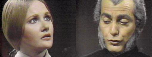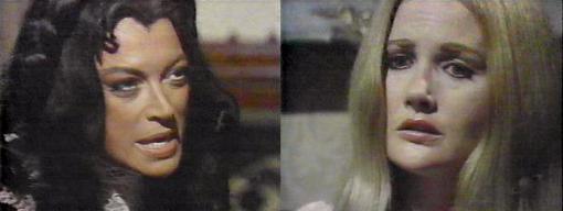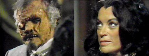 "And let the police know that one of the Collins family is a vampire?" asks Magda slyly, which makes Edward bloat up with anger. No, she says, you have too much family pride. Something you know nothing about, he retorts. Be angry at Mr. Trask, suggests Magda, because he invited us to stay. He hasn't the authority, thunders Edward--he isn't Collinwood's master. (Tell HIM that, Eddie.) Look again, advises Magda--"I think he is!" Edward promises to deal with the good Rev when he returns from town. Magda is grinning as he leaves, pleased--for a moment--she has worries, too, and looks out the window. Barnabas is there. It appears you had a busy night, he says. Much happened, she agrees. Much usually does, when left with you, he comments--tell me everything. She sits down and says, you've got to forgive me. For what--what did you do? asks Barnabas. Before Quentin went through the transformation, she explains, he begged me to get the hand to help him. That was forbidden, Barnabas reminds her. He was in such pain, she says, I felt so sorry for him... Tell me what happened, demands Barnabas. It had no effect at all, she says. How can she be so sure? Asks Barnabas. Because, she says, he still went through the transformation, turned into a werewolf, ran off, and. . .and was captured by the police--I tried to stop him, but I couldn't!