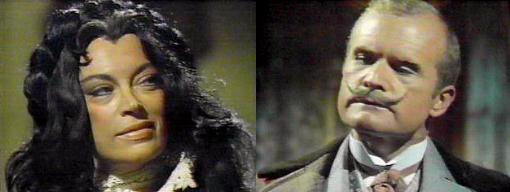Edward goes to the Old House, angrily knocking at the door. Magda checks to see who it is before admitting him. He's astounded--you are staying here after your involvement with Barnabas? "We gypsies do what we got to do," she says simply. Meaning that you know where he is, he says, and still trying to help him. Magda refuses to admit that. I think Barnabas must be paying you well for your loyalty, he says, but it won't do him any good--we'll find him as we found Dirk--I'm fully protected from him as long as I wear this (he shows her the cross) and wield this (his trusty pistol, loaded with silver). Barnabas must be found before you can use the gun, Magda reminds him. We found the other supernatural creature--the one wandering the woods, says Edward. Magda, uneasy, asks, where did they find this animal? He notes her concern and seems somewhat amused--do you know as much about it as Barnabas? (uh huh!) She refuses to answer. I don't think two supernatural creatures appearing at once at Collinwood is a coincidence, opines Edward--I'm sure you know about the wolfman as well as the vampire. I know nothing, maintains Magda. I might know something by morning, says Edward--lycanthrope isn't a foreign term to you, is it? She pronounces it slowly. It's a man who is turned into a wolf when the moon is full, says Edward--isn't that what we have here? I don't know, she says. I'm going to be there when this man chances back into human form at dawn, vows Edward. Where is he now? asks Magda. Safe behind bars at the jail, answers Edward. Magda licks her lips and remarks, I hope you won't be disappointed in the morning. I hope YOU won't be there by then to find out, says Edward--I want you gone from Collinwood by tomorrow, my orders, and I'll enforce it by the police, if necessary.