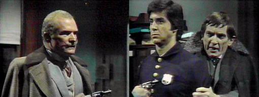 Barnabas goes out to where Edward is talking to the deputy. Edward shouts, "Barnabas!" and holds up his cross. Barnabas recoils, then grabs hold of the deputy, using him as a shield. Put away the gun, he warns Edward, unless you want to shoot my innocent captive first.