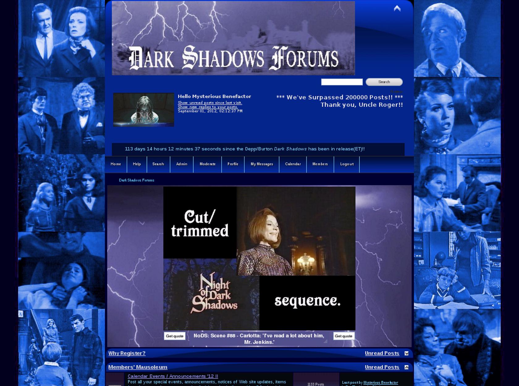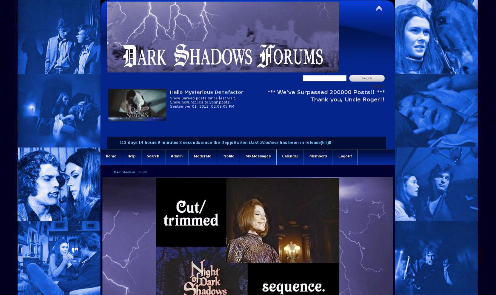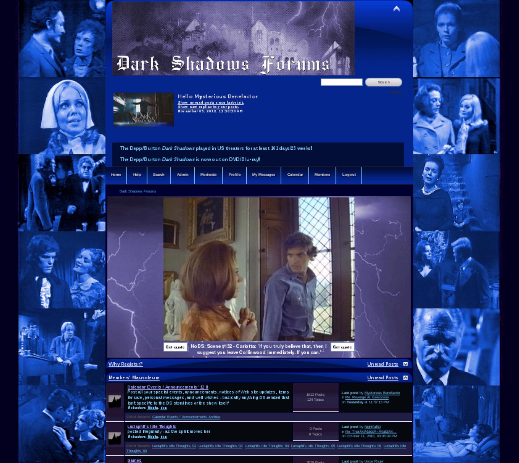 Sadly Halloween has disappeared into the mists for another year and with it the new Halloween Theme, so the forum has returned to the Midnight Storm Theme. And members will no doubt note that the only background and logo coming up is still just for the Depp/DS film. That's because I haven't had the chance to make new backgrounds for November for the original series, the original film (NoDS), and the '91 DS - but hopefully I'll get to that tomorrow.  [hall2_smiley]