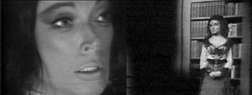 Old House - seance - Barnabas calls to Julianka's spirit--gypsy of the Romana clan, only you can tell us what we must know--break the silence of the grave and speak to us--penetrate the darkness of the grave and speak to us! Magda and Quentin, who have joined hands with him, look nervous, especially Magda. Wind fills the room. Thunder rolls. Julianka's spirit calls to them: "I do not like death at all!" she complains, appearing to them. Tell us what we must know, says Barnabas--I beg you. Beg from now until the time I am made flesh and blood again, she snarls, stepping creepily down--I will tell you nothing--you called me here, I came, I died before my time. "How could we know, we needed your help?" asks Barnabas desperately. You meant me no harm, but caused my murder, chides Julianka--I am dead now! We had nothing to do with your death, says Barnabas. I met my blood in your woods while I was gathering the blood of the orris root to take a curse from one of your number, says Julianka--the orris root was in my hand when I died, but it was my blood that was on it--"and he who is cursed among you will remain cursed forever!, forever, forever.. . ." Quentin cries, I can't listen to this!, and runs out. It wasn't Quentin's fault, protests Barnabas, nor is he the only one who suffers from the curse--there are two young children whose mother was a gypsy! I refuse to help them, says Julianka, my own blood or not--they no longer deserve the name because of her--and she points an accusing finger at Magda, who cries out. Stay away from me, begs Magda. Julianka says, I will go away and stay away forever, but before I do, I will lay my curse upon you. "You stole the hand from your own people, you who severed the chains that must be linked together forever. You who dishonored us--you deserve to die!" Then let me die, sobs Magda. No, says Julianka, my curse will bring you tears and more tears, and more graves and only loneliness... What do you mean? asks Magda.