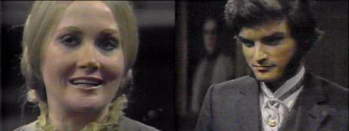 Quentin listens to his music in the drawing room, the inevitable glass of booze in his hand. "So I'm a father, he thinks--there was going to be another Quentin Collins, but he died (who said the kid's name would be Quentin?) And my daughter...what about her? Is she like Jenny? Dare I go see her? Dare I? Charity comes downstairs, hears Quentin's music, opens the door a second, then closes them. She checks her appearance, pinching color into her cheeks, then enters the drawing room. Might I come in? she asks. You almost did, a second ago, he reminds her. I remembered something I had to do, she says. Didn't take you long, he remarks. I'm very quick, she says, looking upset that he's drinking. "Brandy at this hour?--that's what you're thinking, isn't it?" asks Q. Charity touches her hand to her lips and denies that--I like seeing a man take a drink in the daytime, she says unconvincingly--I enjoy sophisticated men--why do you drink? I'm in sorrow, he says. For poor dear Judith? asks Charity. No, for myself, says Quentin, pouring another drink, for my life, in fact, I have several sorrows. He waves the decanter of booze under her chin and asks, would you care to drink one of them away for me? She leans away from the smell of the brandy and chuckles--I'll join you, she agrees, but I'll have sherry. What if your father walks in? he asks. I'll lock the door, replies charity. Then you'll be even MORE compromised, smirks Quentin, pouring her a drink. She laughs, covering her mouth. Don't you know what happens to nice ladies who are in locked rooms with drunken bachelors? he asks. You're a widower, she reminds him, which elicits a bitter comment from him. He asks, do you know I'm also a father?--I say that because I don't know who has heard these things and who has not. I didn't know, Charity says. I AM a father, he says. I had no idea, she says. Does that frightens you? he asks. No, it just makes me sad, she says--your wife must have been very young and beautiful when she died. "So I'm told," says Quentin. It's understandable that you didn't remarry, but I'm sure in time you will find that you do need someone, just as my father found out quickly after Mama died. He needed JUDITH, I think, says Q tellingly. Man isn't meant to live alone, says Charity, at least I've been told. You succeeded, he says. Not very well, says Charity, I long to be more settled.