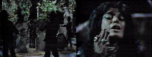 King Johnny and Istvan lead Magda to the cemetery, where the trouble started--where you found Barnabas Collins.  Istvan unties her.  How do you know about him? asks Magda.  All there is to know, he says--a lion, a ring, a door, where that door leads.  Who told you? she asks--Sandor?--I suppose you tortured him a lot to make him reveal that.  Your Sandor was a nice fellow, says Johnny, walking toward the Collins tomb--I hated to see him die.  You killed him, accuses Magda.  You did it yourself, insists Johnny, you made me do it when you stole the hand.  He opens the wrought iron door; they enter the tomb.  This is where it all started, says Johnny, opening a door you should have left closed--this is where it will end--you will go on trial, right now.  Here? asks Magda--what about Boston?  Forget Boston, says Johnny.  Where is the jury? She asks--no one else is here!  I will be judge and prosecutor, says Johnny.  That ain't fair, insists Magda.  Open the door to the secret room, commands Johnny, and see what you find--this time!  She does as ordered, pulling the ring in the lion's mouth.  Inside is a table, candles.  The jury will be here in time, says Johnny--do you remember Andras, the gypsy who strangled my wife years ago?--and Milo, who killed my brother?--they're on your jury.  But they're dead! says Magda.  Yes, says Johnny, the whole jury, murderers all--they're what you deserve and what you're gonna get--"Black as the night, as death, as wings of the raven!" calls Johnny, arms upraised.  "Cat that howls in the night, black as the depths of hell where your souls are condemned--let these candles light your way back to earth.  Andras!  Marcos!"  A ghost appears and walks past Johnny, then another.  Magda watches in horror.  "Stefan, Gregor!" yells Johnny.  Two more gypsies come in, one wearing an eye-patch.  "Sergio!"  Another gypsy appears and walks down the steps.  All are very motley-looking fellows.  All condemned to death by their people, says Johnny, murderers all!--Istvan, take your place, the trial will begin.  Johnny introduces Magda as "one of your own--a thief--she stole the hand of Count Petofi, the most precious possession, to use on a gadjo, an outsider.  Magda speaks up--I also took it for Jenny's baby!  Silence, orders Johnny, I'm talking now!--she stole the hand, charge one; charge 2, she murdered Julianka, no ordinary gypsy.