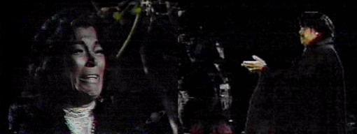 The ghosts close in on the sobbing woman as she hangs her head and cries.  Then she stops, holding out her hand.  "In the name of gypsy women who wept for you," she intones, "I know your crime, I order you to go back to sleep without ending, back to death before the tears are dry on my cheek, go walk the earth no more!"  She cries, patting the tears on her face, and all the ghosts disappear.  She hears Johnny's laughter and is hysterical, begging him, stop the game, it isn't a game--stop it!  Keep going, running, he orders, the game isn't over--I'll tell you when it is!  She runs off.  Johnny appears where she was just standing, laughing and laughing.
