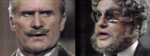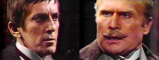 Quentin, says Edward. Quentin is charming boy, says Petofi, I find him most amusing, but I don't always believe him--do you? No, admits the latter. But you choose to believe him in this case? queries Petofi. Perhaps I wouldn't have, says Edward, if you hadn't presented yourself under a false name--that's unforgivable! Perhaps there were reasons I was forced to adopt that singularly graceless copy, suggests Petofi. What reason? demands Edward. Imagine, says Petofi, something enormously valuable stolen by the gypsies--I had reason to believe the gypsies on your property had what was stolen from me (he pours some drinks)--had you known my true name, you'd have prevented me from getting it back. Did the gypsies have it? asks Edward. When I found out they did not, I assumed my true title, by then, you and I had drifted apart. Petofi hands him a drink, reminding him how delightful those first few days at Collinwood were--I felt at last I'd met someone with whom I could share all my experiences, says the Count. Edward reluctantly admits, I felt that, too. I am desperately anxious to redeem my good name with you, says Petofi--if I help you capture Barnabas, would that make up for the injuries you blame me for? Why do you think I'm hunting Barnabas? asks Edward. "Because he is your enemy," says Petofi, quaffing his drink--"The greatest danger that exists to the Collins family--shall I say more?"