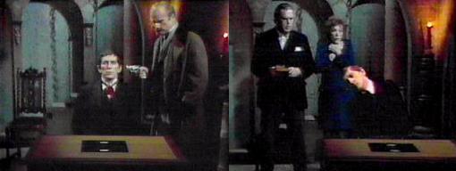 Barnabas sits in a trance while his astral body rises from his flesh, stands, and walks. Edward comes down the basement stairs, points his gun at Barnabas and gazes at him, poised to kill his cousin. Meanwhile, Barnabas' astral body approaches the door upon which the I-Ching wands appear to be glued. The door opens. Edward gazes at Barnabas, then shoves the wand off the table. The door snaps shut on Barnabas' astral body. Barnabas' head rocks violently, seeming to send him onto a convulsion.